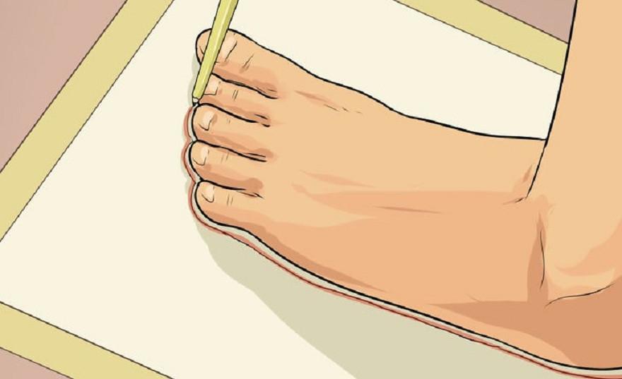 Bạn sử dụng bút chì để vẽ một đường thẳng đánh dấu vào các điểm trên cùng , dưới cùng CỦA NGÓN DÀI NHẤT và 2 bên PHẦN RỘNG NHẤT của bàn chân như hình ảnh dưới để chúng ta đo chiều dài chân.